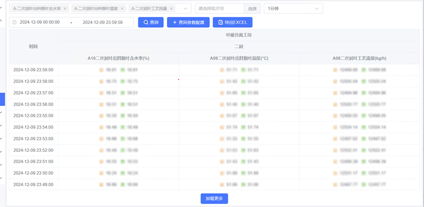 复烤过程中的所有数据都严格伴随时间戳产生,呈现高度连续的时序特征。各类工艺参数——如复烤机不同温区的温度、湿度变化——会直接影响“配方片烟”的含水率、色泽和香气等关键质量指标。因此,必须能够精确追溯每一批烟叶在加工过程中经历的完整工艺曲线,以保障品质稳定与工艺优化。
