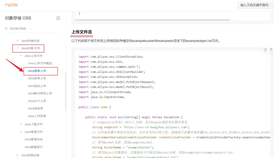 1)首先我们需要来打开阿里云OSS的官方文档,在官方文档中找到 SDK 的示例代码: