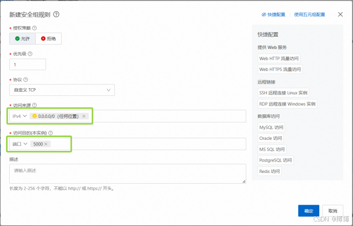 阿里云ECS默认会拦截所有未明确允许的端口,必须手动添加规则开放5000端口: