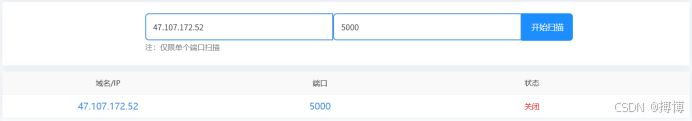 输入公网IP和5000端口,检测是否“开放”(存在延时,也可能不准确)。