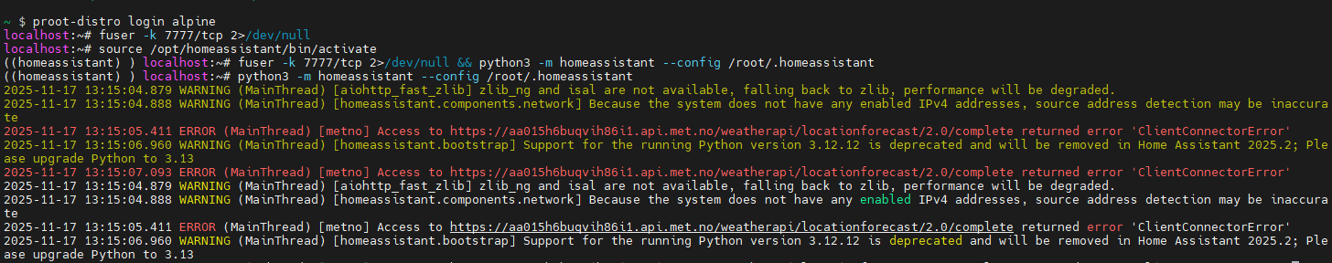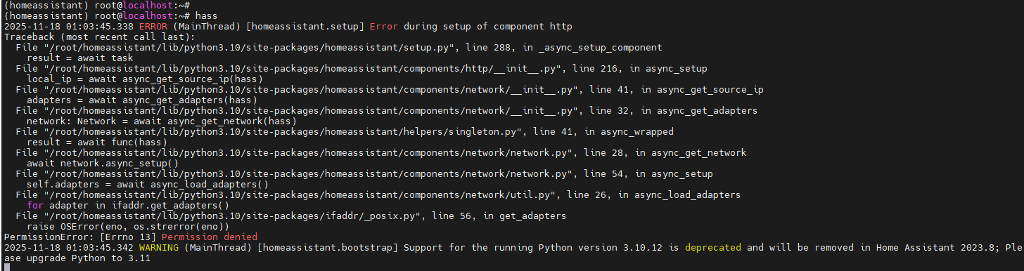 可惜功败垂成!可能是选用了ubuntu的原因(这里选用了ubuntu22),此方案一样始终无法获得或者绕开权限,导致Home Assistant无法运行。使用proot-distro安装ubuntu(这里选用了ubuntu25)的时候也有类似的问题,直到换了Alpine Linux。