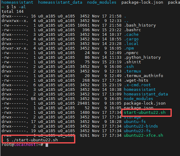安装成功ubuntu之后,在Termux的根目录下,生产了一个start-ubuntu22.sh的文件。每次启动ubuntu,只需要运行