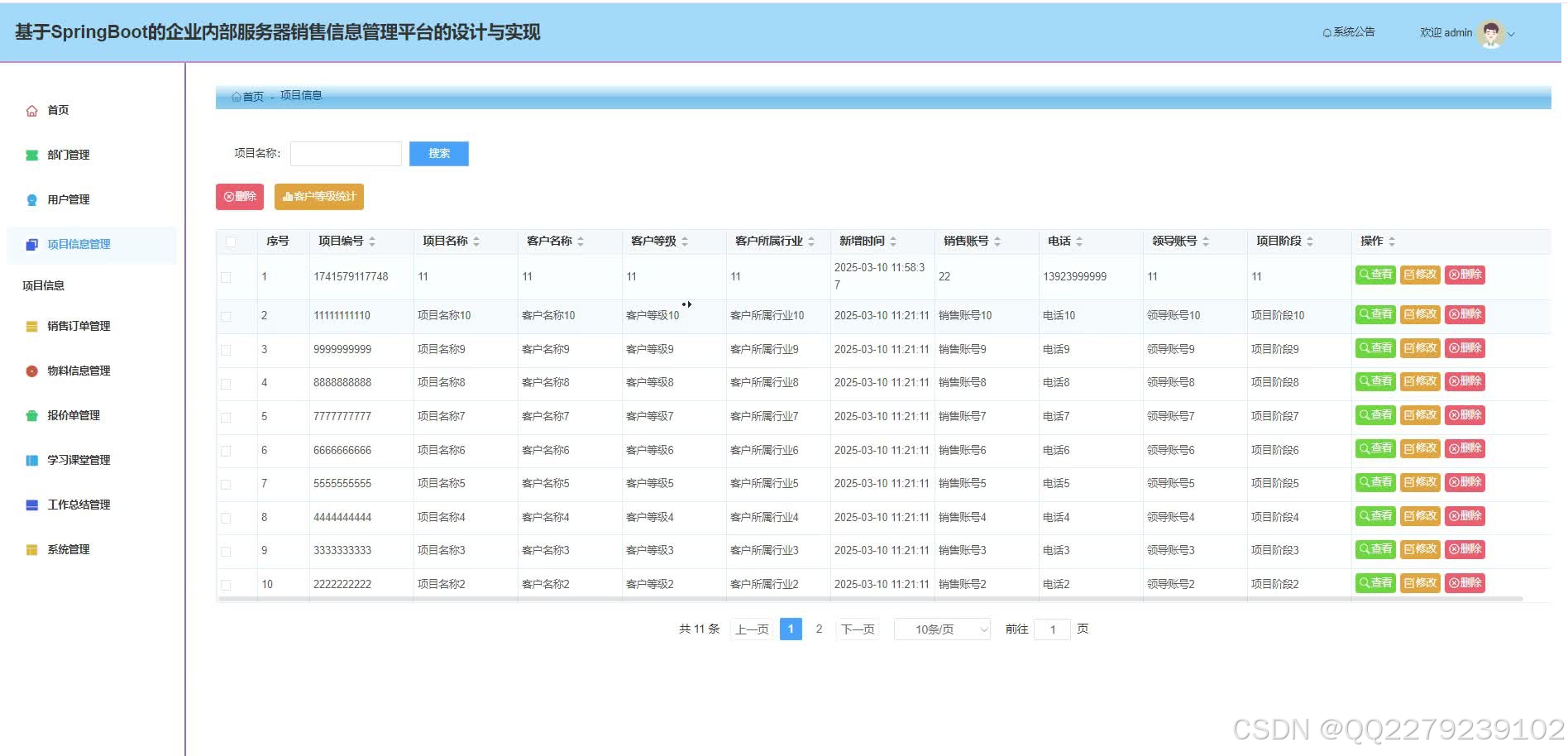 针对企业内部服务器销售信息分散、订单跟踪困难、数据统计低效等问题,设计并实现基于 Java Spring Boot 的企业内部服务器销售信息管理平台系统。系统采用 Spring Boot 构建后端服务,结合 MyBatis-Plus 实现数据库高效操作,前端通过 Vue.js 与 Ant Design Vue 搭建交互界面,搭配 MySQL 数据库确保销售数据安全存储。