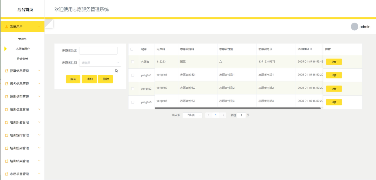 管理员有权限管理系统中的所有用户账户,包括志愿者、会长以及其他管理员等。管理员可以进行用户查询、添加、删除等操作,并能修改和更新用户的相关信息。界面如下图所示。