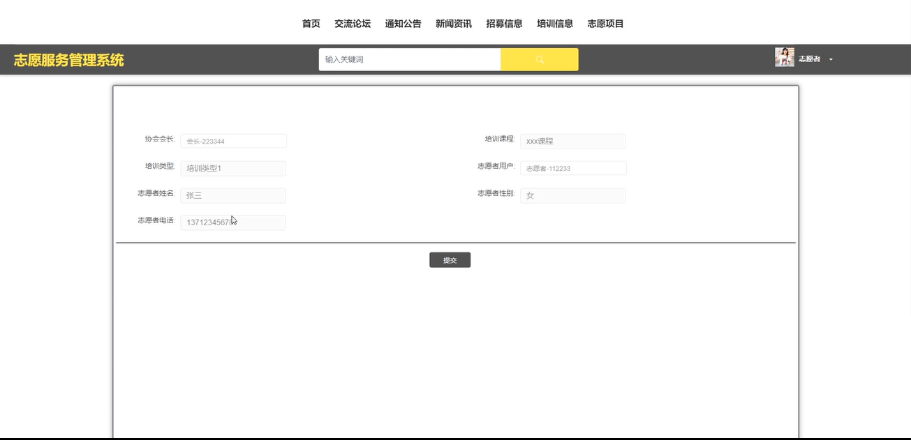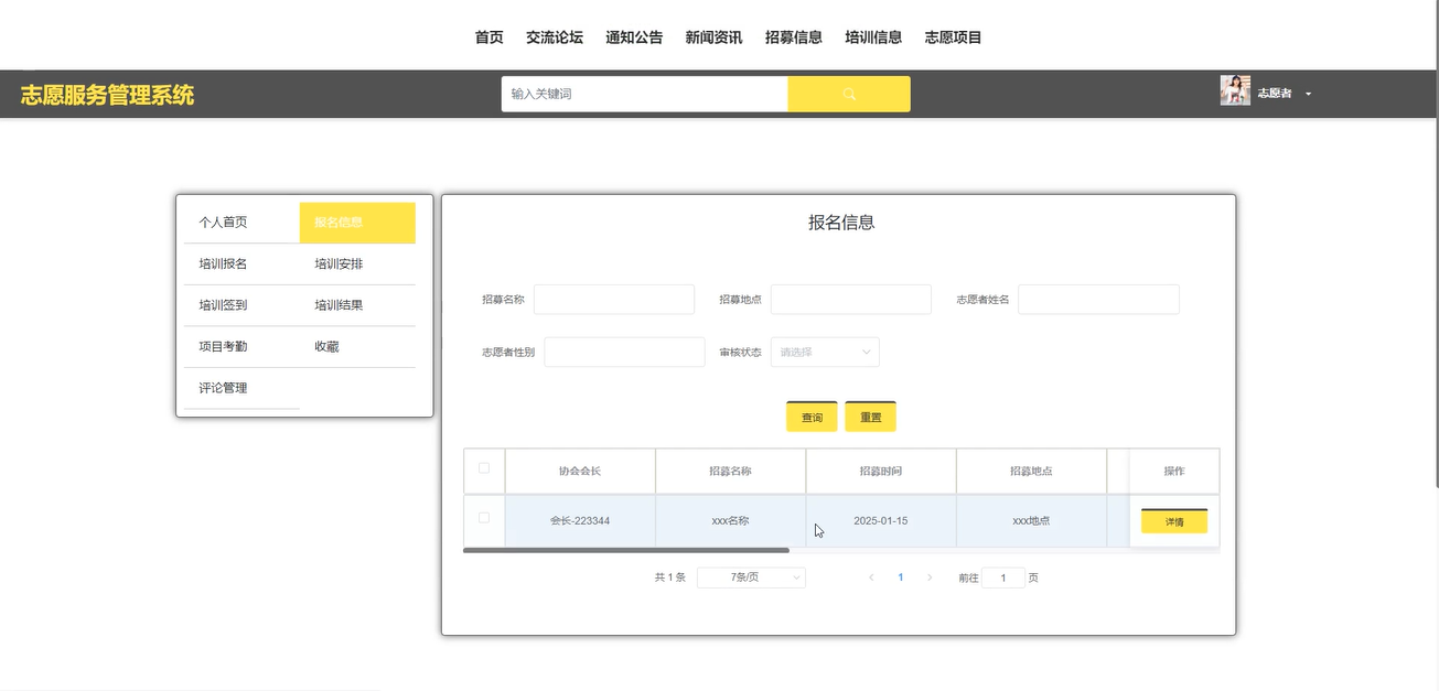 志愿者可以查看报名信息详情,通过输入招募名称、地点、志愿者姓名、性别和审核状态等条件进行搜索查询,并重置搜索结果。此外,还可以查看会长用户的审核回复。界面如下图所示。