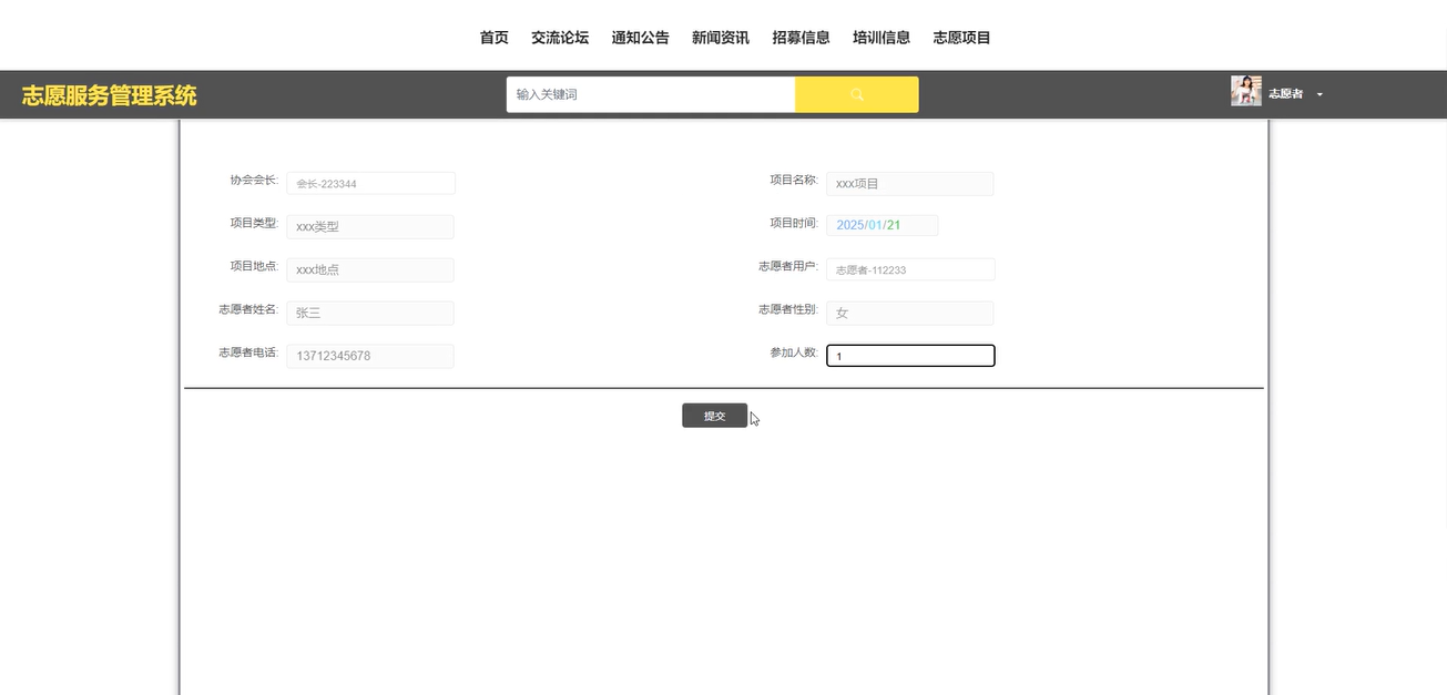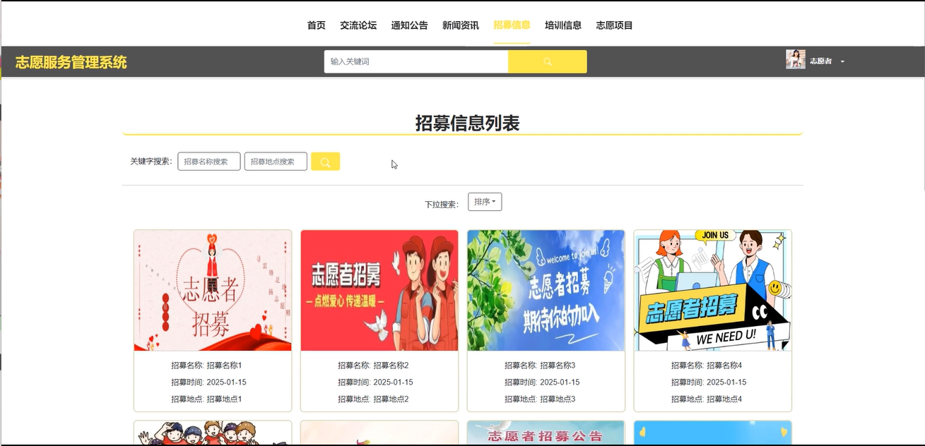 志愿者可以查看详细的志愿项目列表,包含项目名称、时间、类型等信息,并通过输入项目名称、类型和下拉排序搜索找到感兴趣的项目。他们还可以对项目进行点赞、收藏和评论,并报名参加。界面如下图所示。