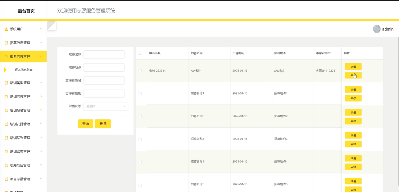 管理员能够查看所有志愿者的报名信息,包括招募名称、地点、志愿者姓名等详细信息。管理员有权限审核报名资料,确认是否符合条件,并可删除无效或重复的报名信息,确保报名数据的准确性。界面如下图所示。