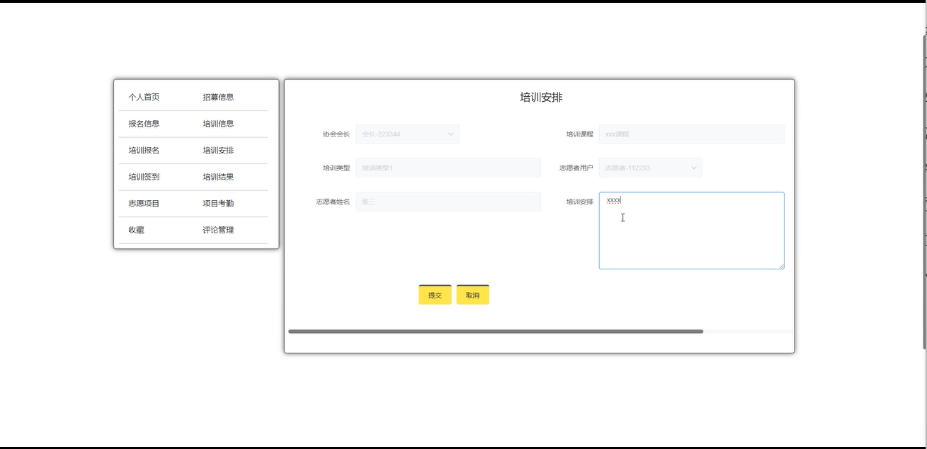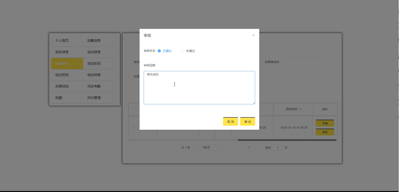 会长用户可以查看用户培训报名信息进行审核并安排,通过输入培训课程、类型、志愿者姓名、性别和选择审核状态等条件进行搜索查询,并重置搜索结果。界面如下图所示。