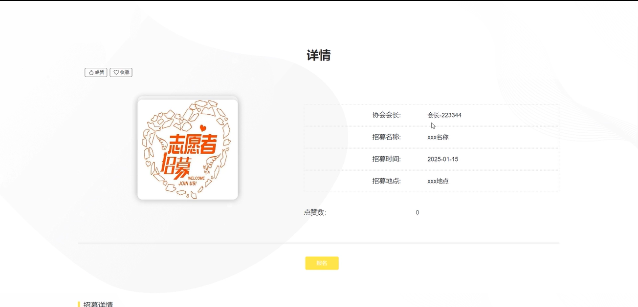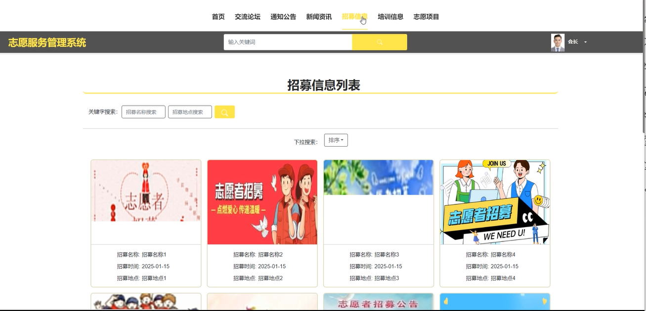 会长用户可以查看详细的招募列表,包含招募名称、时间、地点等信息,并通过输入招募名称、地点和下拉排序搜索找到感兴趣的活动。他们还能对活动进行点赞、收藏和评论,回复志愿者评论,并删除活动。界面如下图所示。