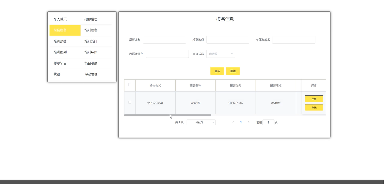 会长用户可以查看用户报名信息进行审核,通过输入招募名称、地点、志愿者姓名、性别和审核状态等条件进行搜索查询,并重置搜索结果。界面如下图所示。