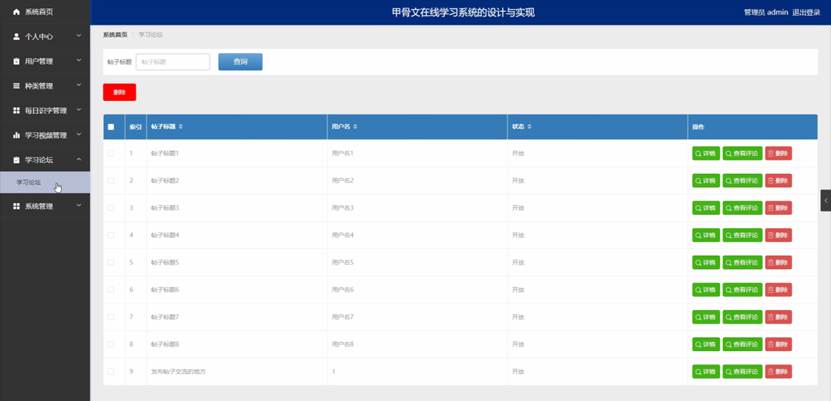 管理员点击学习论坛。在学习论坛页面输入帖子标题进行查询或删除学习论坛列表,并根据需要对学习论坛详情信息进行详情、查看评论或删除操作;如图5-12所示: