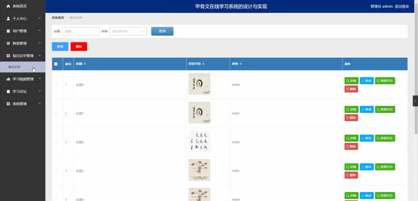 管理员点击每日识字管理。在每日识字页面输入标题、种类进行查询、新增或删除每日识字列表,并根据需要对每日识字详情信息进行详情、修改、查看评论或删除操作;如图5-10所示: