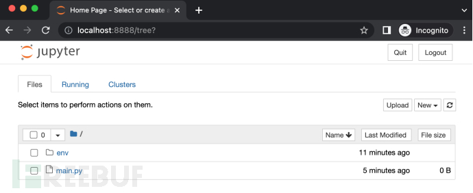 此时,任何用户在知晓Jupyter Notebook服务所在互联网IP的前提下,在Web浏览器中输入“http://…:8888”访问Jupyter Notebook服务,无需身份验证,便可以直接查看服务器上的代码和文件。注意,这种情况下,网页标题内容是:“Home Page - Select or create a notebook”。