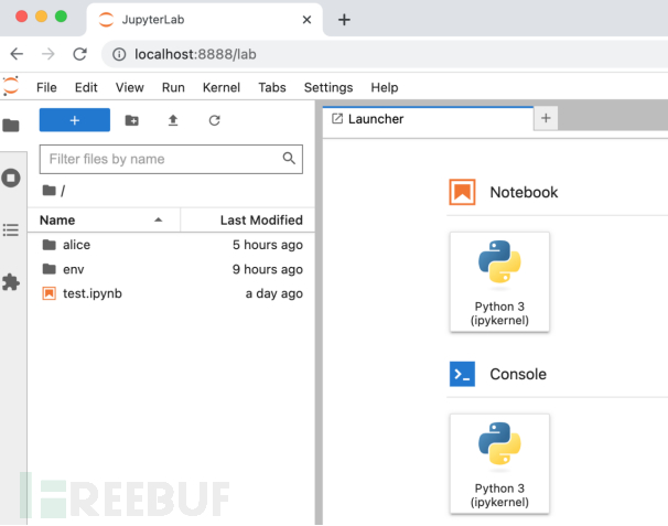 此时,任何用户在知晓JupyterLab服务所在互联网IP的前提下,在Web浏览器中输入“http://*.*.*.*:8888”访问JupyterLab服务,无需身份验证,便可以直接查看服务器上的代码和文件。注意,这种情况的网页标题内容是:“JupyterLab”。