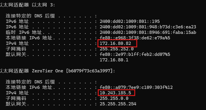 上面的是主机在局域网下的IP地址,下面的是ZeroTier局域网下的IP地址,记住这是主机的。