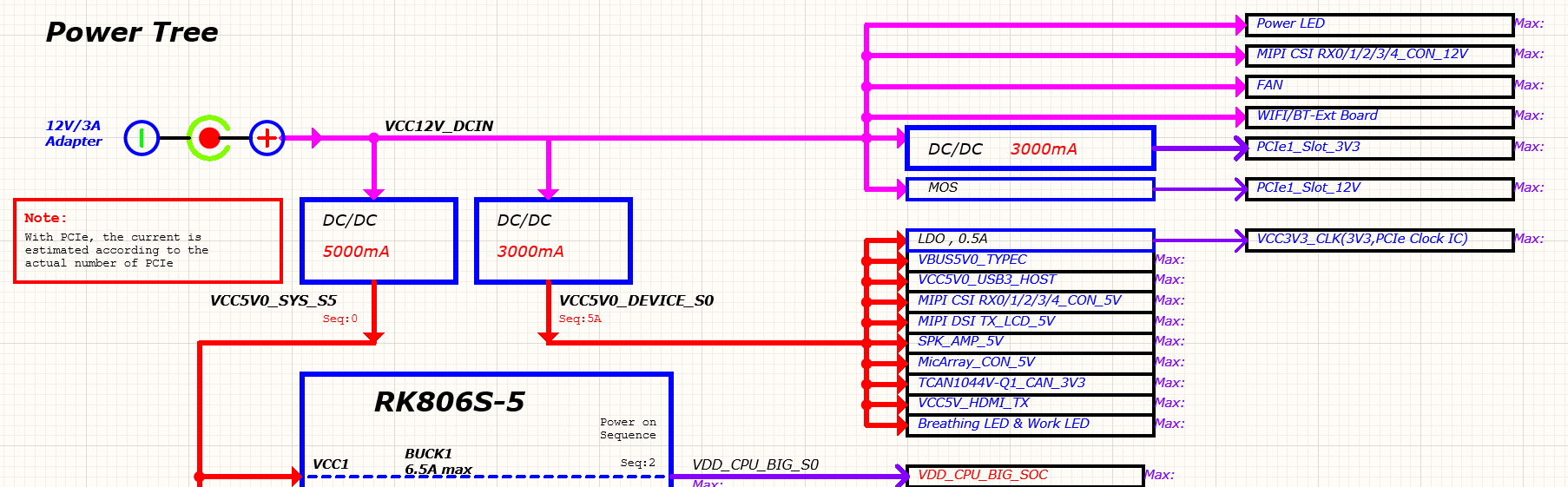 - 系统电源VCC5V0_DEVICE,供给外围设备使用,比如:MIPI、CAN、