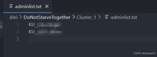 在 accounts.klei.com 找到自己的 klei ID, 添加到 ~/.klei/DoNotStarveTogether/Cluster_1/adminlist.txt. 添加多个直接换行就行.