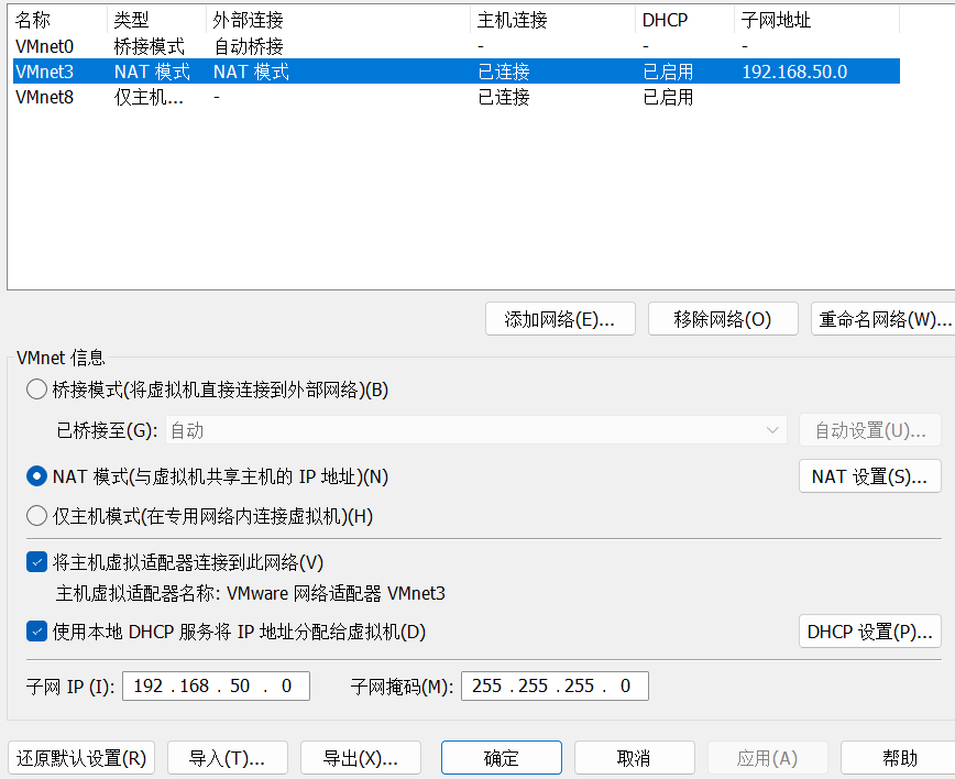 网络配置的话,比赛建议直接改自己的虚拟网卡配置。先选中工具栏中的编辑,点击虚拟网络编辑器,然后我们把自己的虚拟网卡的子网IP的C段改成50,与服务器主机保持一致,可以查看一下DHCP,一般会自动改,没有变化的话就手动改一下。