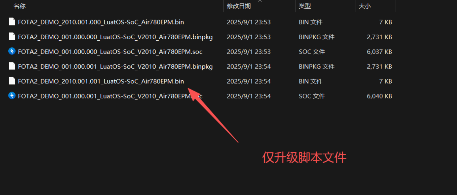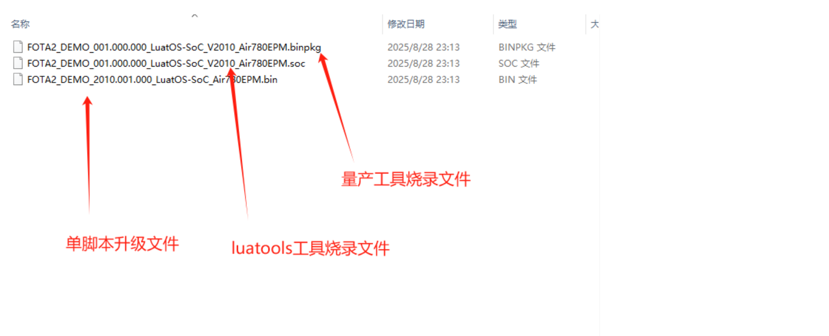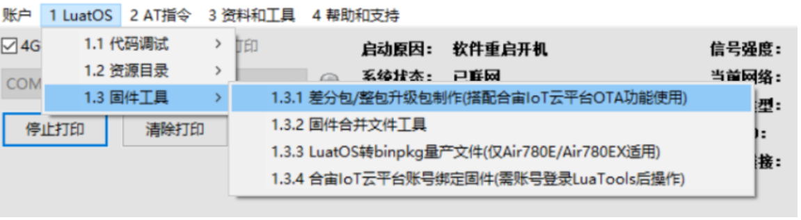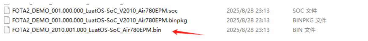 注意:对于不同后缀的固件,不能直接升级,分区有差异,强行升级可能无法启动。 比如:LuatOS-SoC_V2012_Air780EPM_1.soc 只能升级LuatOS-SoC_V2014_Air780EPM_1.soc 后缀的固件,不能升级 LuatOS-SoC_V2014_Air780EPM_2.soc 后缀的固件。
