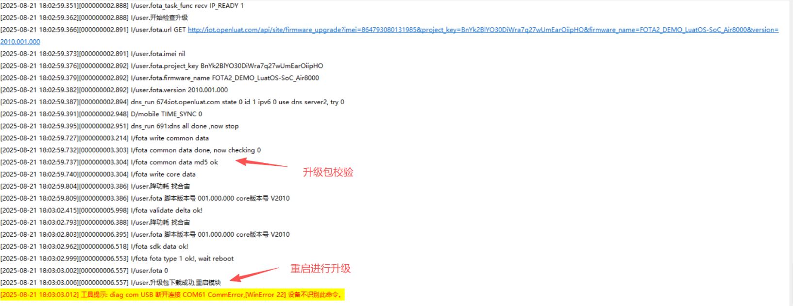 -- 再次走到这里后,合宙iot平台会返回“已经是最新版本,不需要升级”,fota_cb回调函数中会发布消息"FOTA_END"