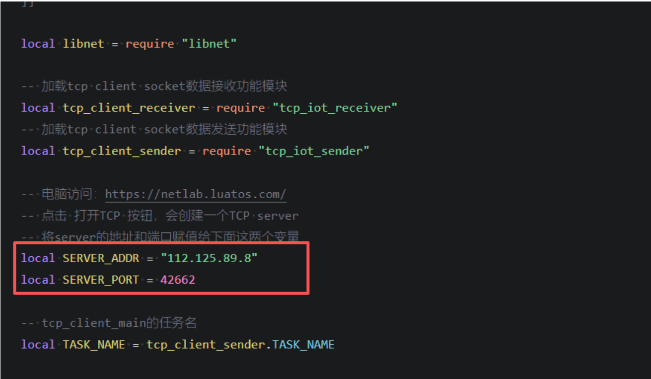 在 tcp_iot_main.lua 中配置 tcp 服务器信息: