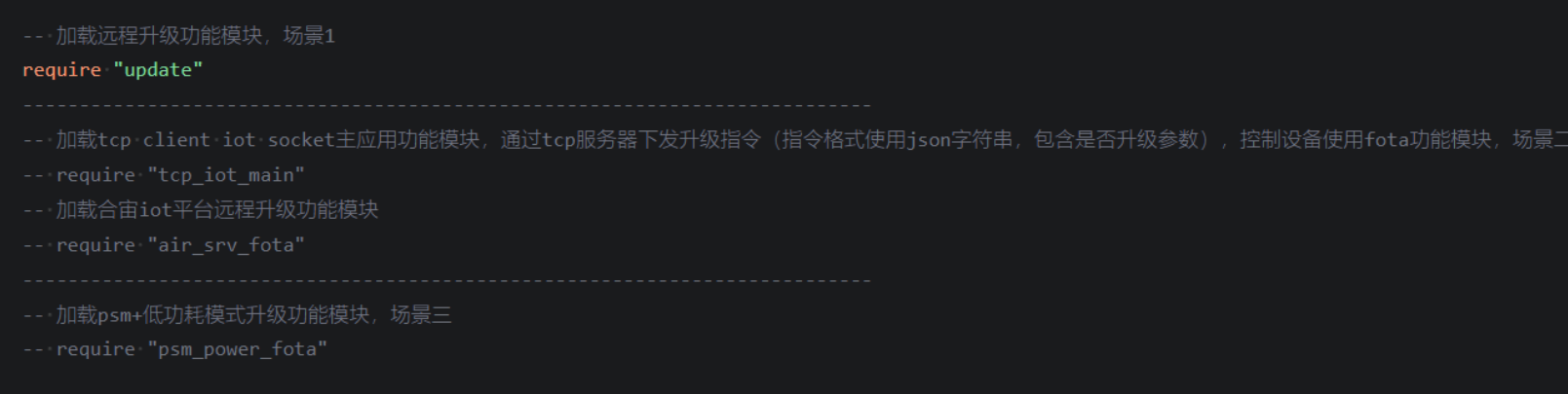 本 demo 将会演示三种场景下的 fota 升级,场景在 main.lua 中切换。