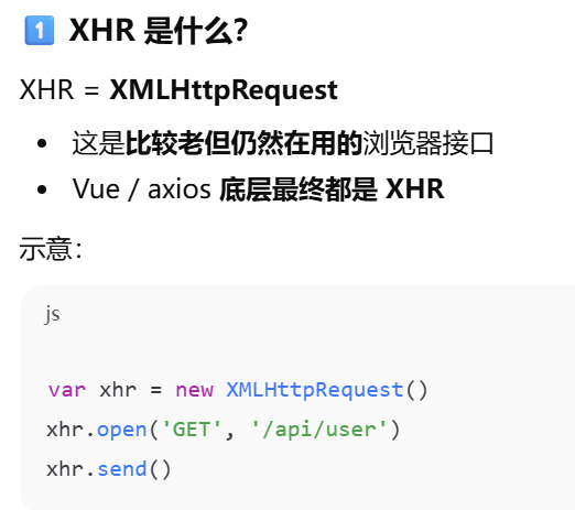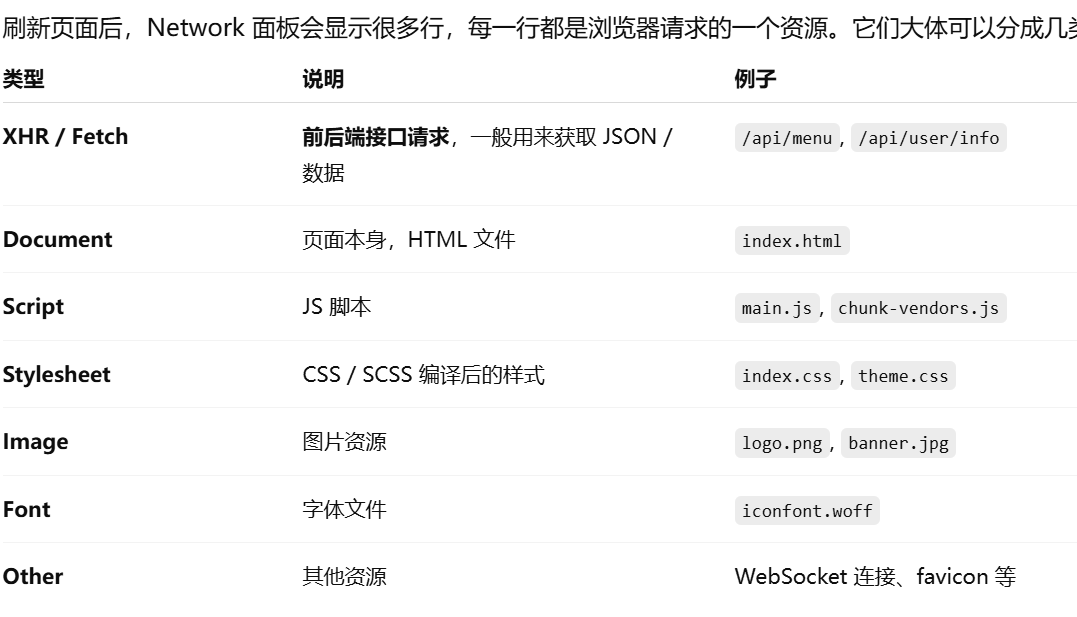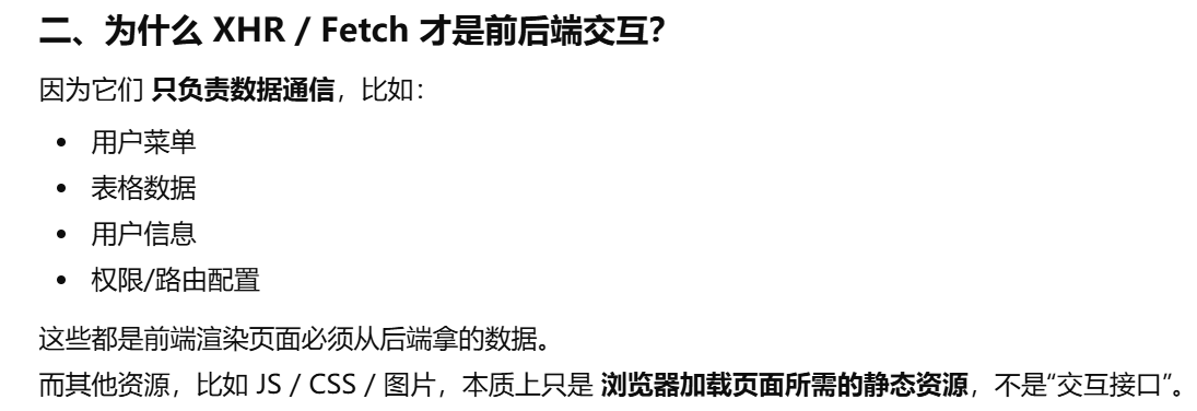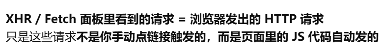 - XHR / Fetch 面板里看到的请求 = 浏览器会向后端发的HTTP请求