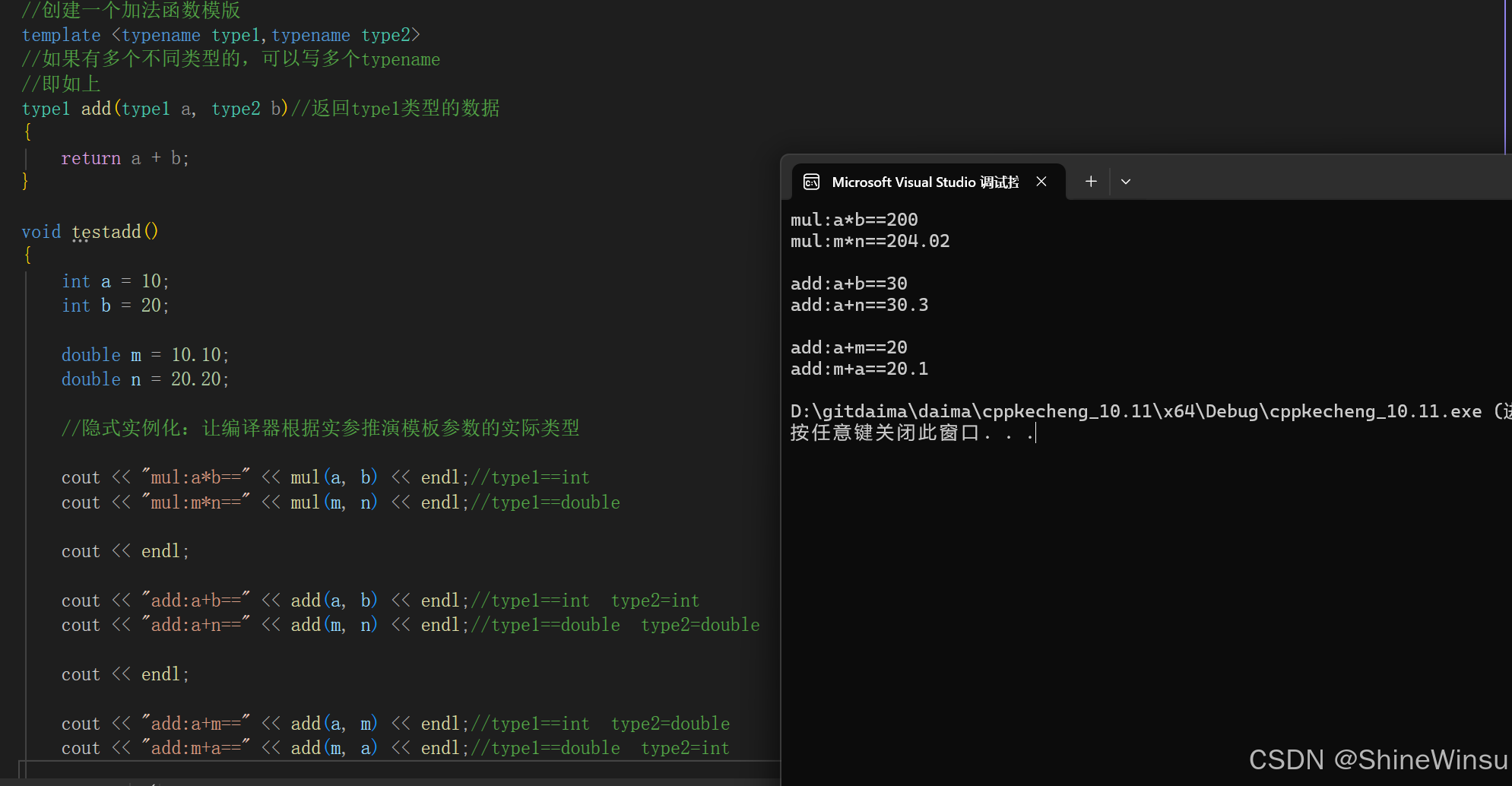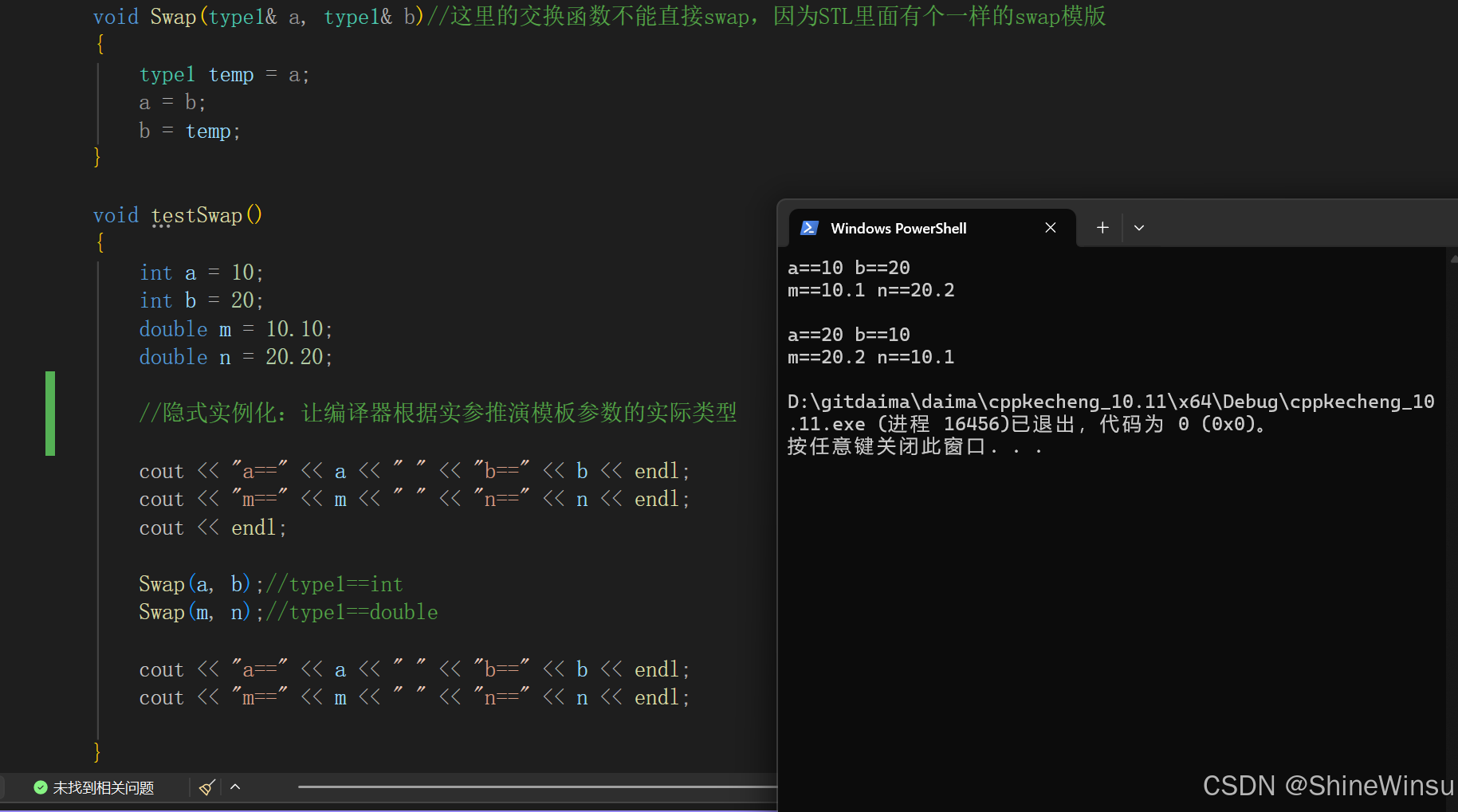 我们运行一下,发现确实是交换成功了,通过一个模版实现了不同类型的交换,而且大家要注意,实际上编译器是生成了两个函数,只不过我们看不到而已,并不是就只是那一个函数模版。