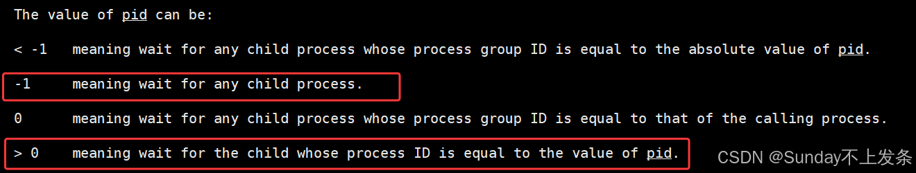 参数pid 传 -1时等待任意进程,即此时与wait 完全相同。即wait(NULL) 与 waitpid(-1, NULL, 0) 作用完全一样。