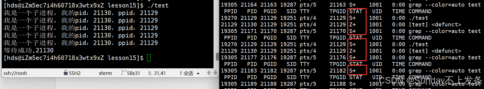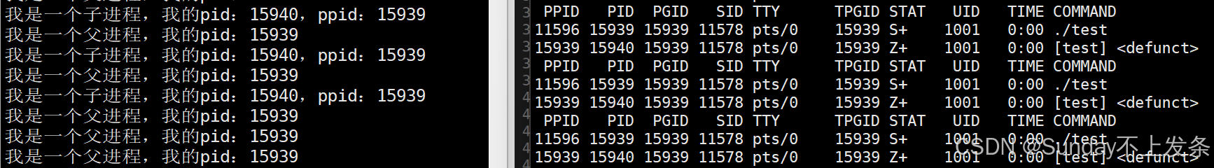 while :;do ps axj|head -1 && ps axj|grep ./test|grep -v test.c;sleep 1; done