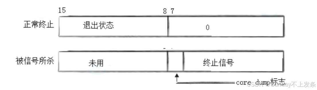 操作系统中用一个整数的低16个比特位(0~15)来存储进程终止的相关信息,高16位不用。低16个比特位又分为0~6记录终止信号(即进程异常退出信息),第7位为core dump标志(先不谈)以及8~15记录退出状态(即正常终止信息)。