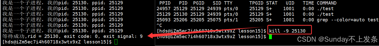 当我们在另外一个窗口杀掉子进程:kill -9 25130