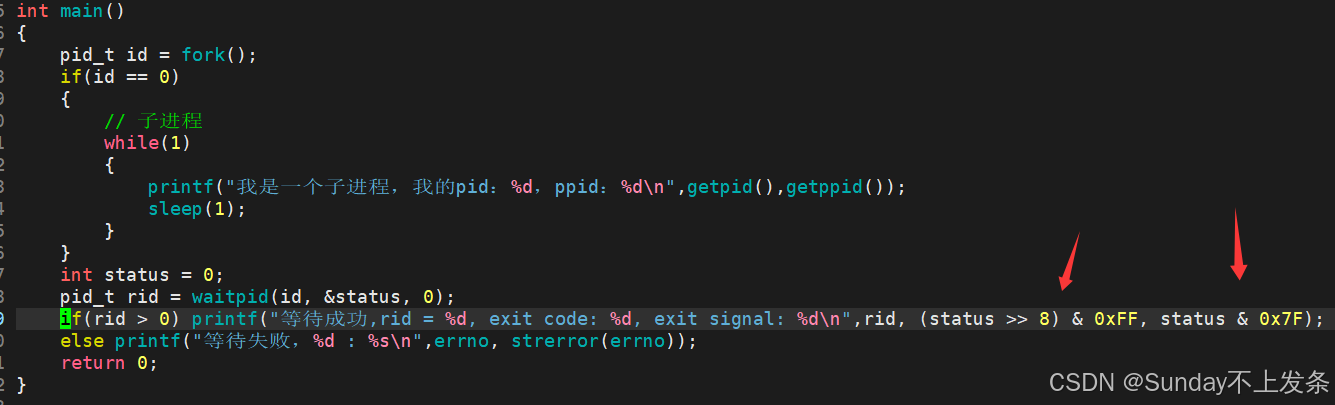 此时子进程会把自己的异常终止信号放在低7个比特位,通过 status & 0x7F 就可以获得status的低7个比特位。