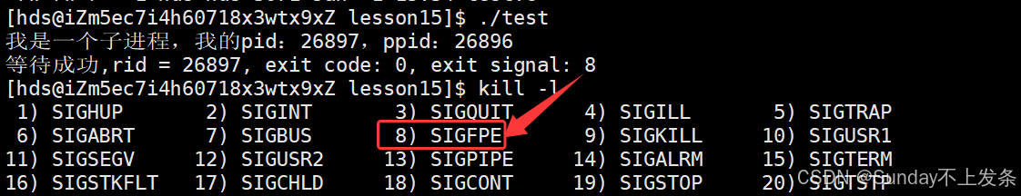 子进程异常终止,父进程等待成功,status 的低 7个比特位的值为8,对应8号信号(算术运算错误:除零错误)。