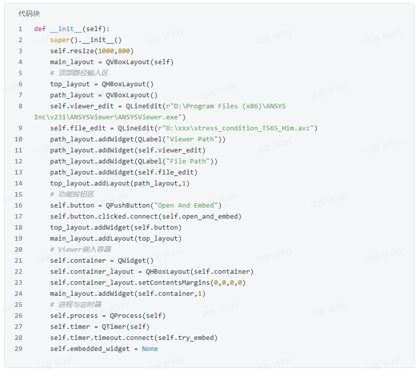 其中,进程对象用于启动外部的 ANSYS Viewer 程序,实现独立进程的调用与管理;定时器则负责周期性触发try_embed方法,轮询检测 Viewer 窗口是否创建就绪。