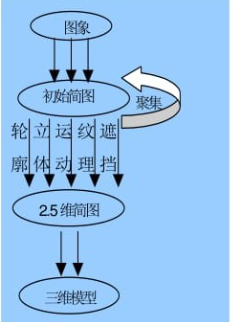 视觉处理过程可以分为三个阶段,这三个阶段分别得出三种表象,分别是初始简图、2.5维简图和3维模型,如图6所示。