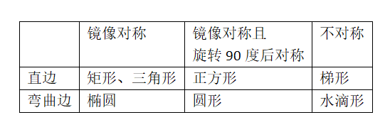 上面讨论了三维几何子,而人还可以感知二维视觉的信息,那么二维几何子又如何表示呢?Biederman使用了横切面的两种属性来确定二维几何子的类型:形状的边的曲直情况和形状的对称情况。一共有7种几何子,如下表1所示。将这7种二维几何子加上上述36种一共就是43种。