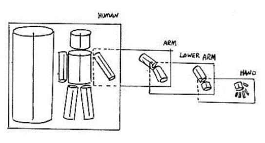 当计算出物体的广义锥,其轴线可作为物体坐标系的轴。事实上,物体的每一部分都可以单独的作为一个物体,因此坐标系也能在物体的各部分上构建。如图15,从左到右四个方块分别表示了人、手臂、前臂和手的坐标系的构建方式。在左边第一个方块中,左边圆柱表示为整个人体的广义锥,其圆柱体的轴线作为人体坐标系的轴线。右边表示人体各肢体相对于坐标系轴线的位置。其中的每个肢体又是一个广义锥;在第二个方块中,左边倾斜的圆柱表示左手臂的广义锥,广义锥内的轴线也是坐标系轴线,而右边表示前臂和后臂相对于该坐标系轴线的位置;...。