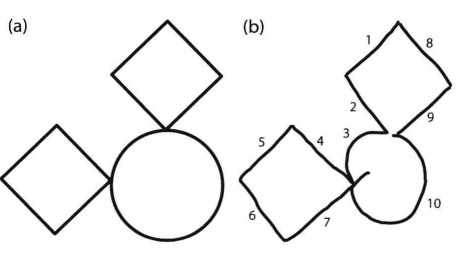 整合性失认证的另一个案例来自Behrmann等人(Behrmann,Moscovitch和Winocur ,1994)的研究,实验者要求患者CK对图5(a)进行临摹,所画图画如图5(b)。令人惊讶的是,CK并不是一个个形状的画(如先画一个正方形,然后画一个圆形),而是一笔笔的画,笔画顺序标示在图5(b)中。即如他先画第1边,然后第2边,然后第3边而非第9边或者第8边...。