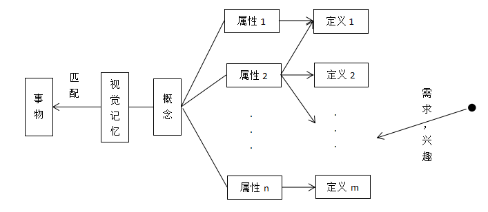 上面提及了分类需要依据需求、兴趣和场景等因素,因此分类是一个认知问题。但一个事实是,无论是需求如何、兴趣如何、场景如何,它们的视觉形象都是不变的。一个人不论是买家、卖家、家长、老板等等不同的身份,这个人的外表特征或者感知属性是相同的。因此,在视觉分类之前,需要有一个视觉匹配的感知过程。视觉刺激先与视觉记忆匹配,然后通过视觉记忆获取其概念,此时物体才会在不同的需求或者情景下得到分类,如图26。