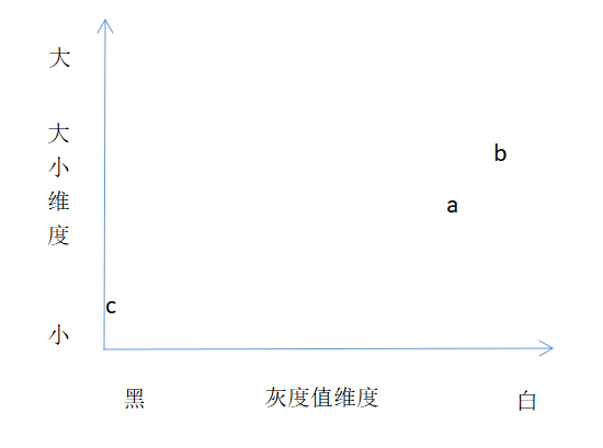 Shepard(1962)的心理距离方式将概念表征为心理空间中的点,概念表征之间的相似性就是它们在心理空间的距离,这种方式类似于空间坐标系。当距离越近,表示两个概念越相似,反之则越不相似。使用下面例子简单说一下这类型相似性的思想。图28(a)中三个正方形具有两种对比属性,一种是灰度值,另外一种是大小。这两种属性构成了心理空间的两个维度(类似于坐标系的x轴和y轴)。从灰度值维度看,图(a)的灰度值与图(b)的灰度值接近,与图(c)的不接近;从大小维度看,图(a)与图(b)更接近,而图(c)的不接近。因此,图(a)与图(b)相似,而与图(c)不相似。在这个心理空间中,表现为图(a)与图(b)的距离更近(图(d))。