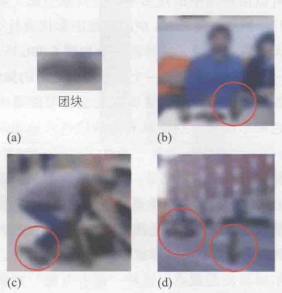 贝叶斯知觉推理这一思想也可以用在环境中的客体推理。环境客体推理同样包含两方面要素:第一,似然估计,即该刺激与某类客体的的匹配程度(与贝叶斯知觉推理的一致)。第二,环境因素,客体的可能类别与环境的一致程度,即在某种环境下出现这种知觉结果的可能性大小,环境因素实际上也是一种先验知识,它需要通过后天学习。以下图31为例,似然概率是单独判断图(a)所属类别及其概率,但是它的可能类别非常之多,判断非常困难;如果结合环境因素,则很容易判断它是来自桌子上的杯子(图(b))(在这种环境下,出现杯子的先验概率是很高的),弯腰人的鞋子(图(c)),街上的汽车(图(d))。