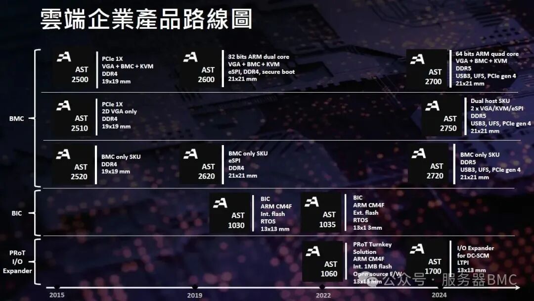 Aspeed公司在2004年成立,从AST2000到这第八代BMC芯片AST2700,是BMC芯片行业的Top1,宣传市场占有率已经是70%(应该更高)。2024年推出了AST2700、2750、2720,AST2700就是普通的BMC芯片,AST2750是在2700的基础上增加了支持双主机的功能,AST2720是2700去掉了VGA/KVM功能(可用在一些没有主机界面的场景,如交换机等)。