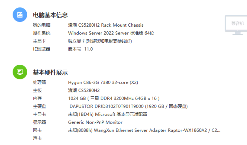 新分配的国产化服务器是浪潮的海光C86架构服务器CS5280H2,查了很多资料了解到C86是购买的X86的授权,然后加了一个国内的壳(就和国产化操作系统一样),理论上这种情况应该是兼容X86架构的软件的,当然这是理论上,实际上还是有一定的限制的。