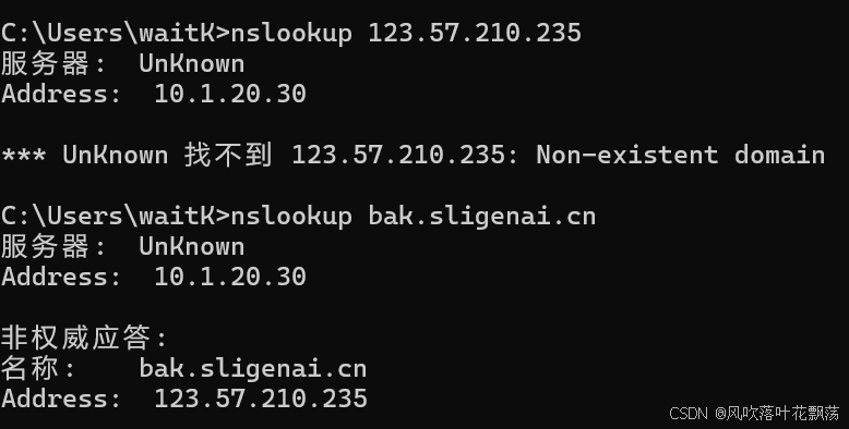 执行 nslookup + 域名,即可查询域名解析对象