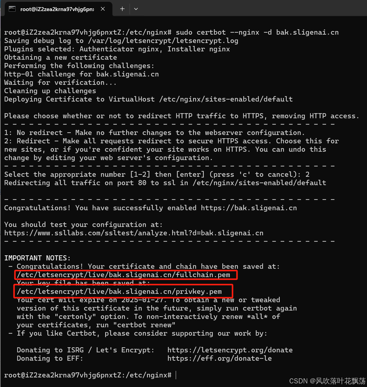 然后就生成好证书了。记得保存好fullchain.pem和private.pem的路径,这个等下会用到。