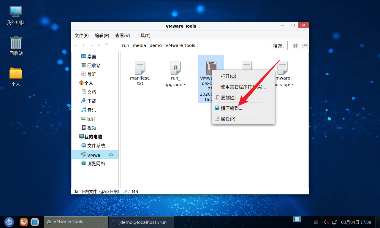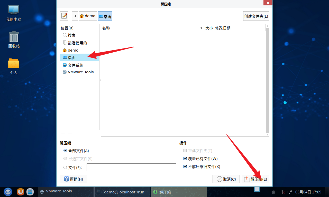 鼠标右键解压到桌面,或者通过终端命令进行解压