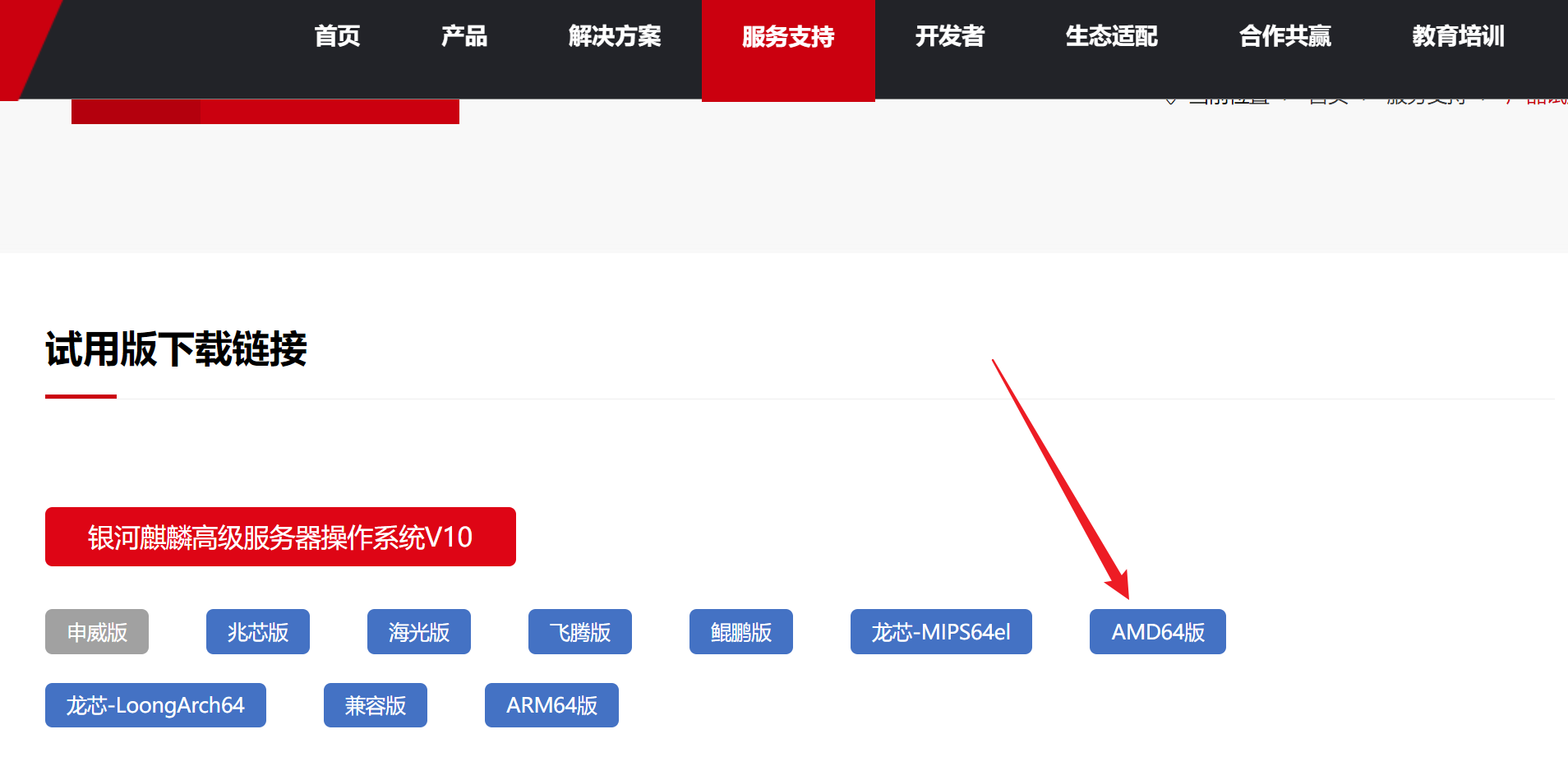在试用版下载界面中选择高级服务器操作系统V10,amd64版下载