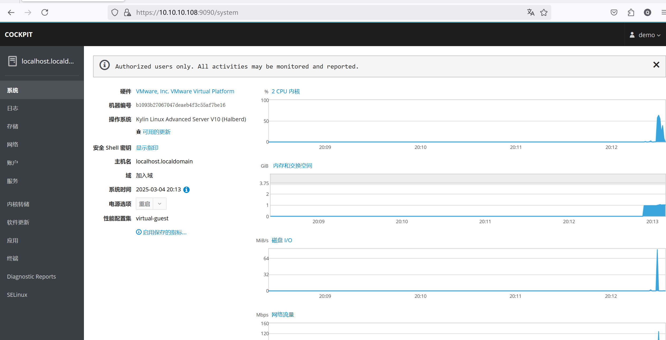 银河麒麟服务器V10可以通过Cockpit Web控制台连接到Linux,通过网页远程连接到Linxu系统上,不止是银河麒麟系统,绝大多数Linux系统都可以通过Cockpit管理Cockpit 使用9090端口,并且为SSL加密访问,通过浏览器登录