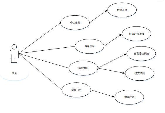 (2)学生模块中的用户角色是学生,学生可以通过登录进入首页后,浏览个人中心、健康信息管理、请假信息管理、核酸预约管理、疫苗预约管理、核酸结果管理、信息提醒管理、健康档案管理,学生模块用例图如图3-2所示。